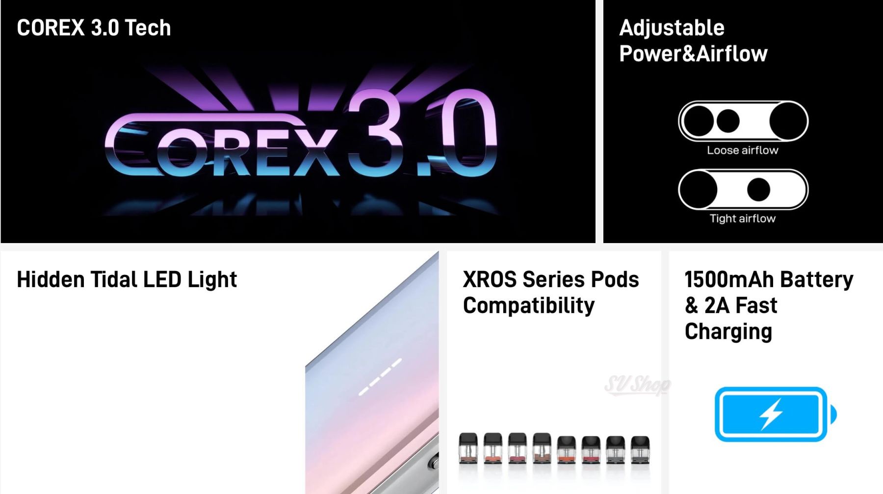 - Картриджі: змінні XROS серії 0.4 Ω, 0.6 Ω, 0.8 Ω, 1.0 Ω (ємність 3 мл), магнітне кріплення, верхня заправка.